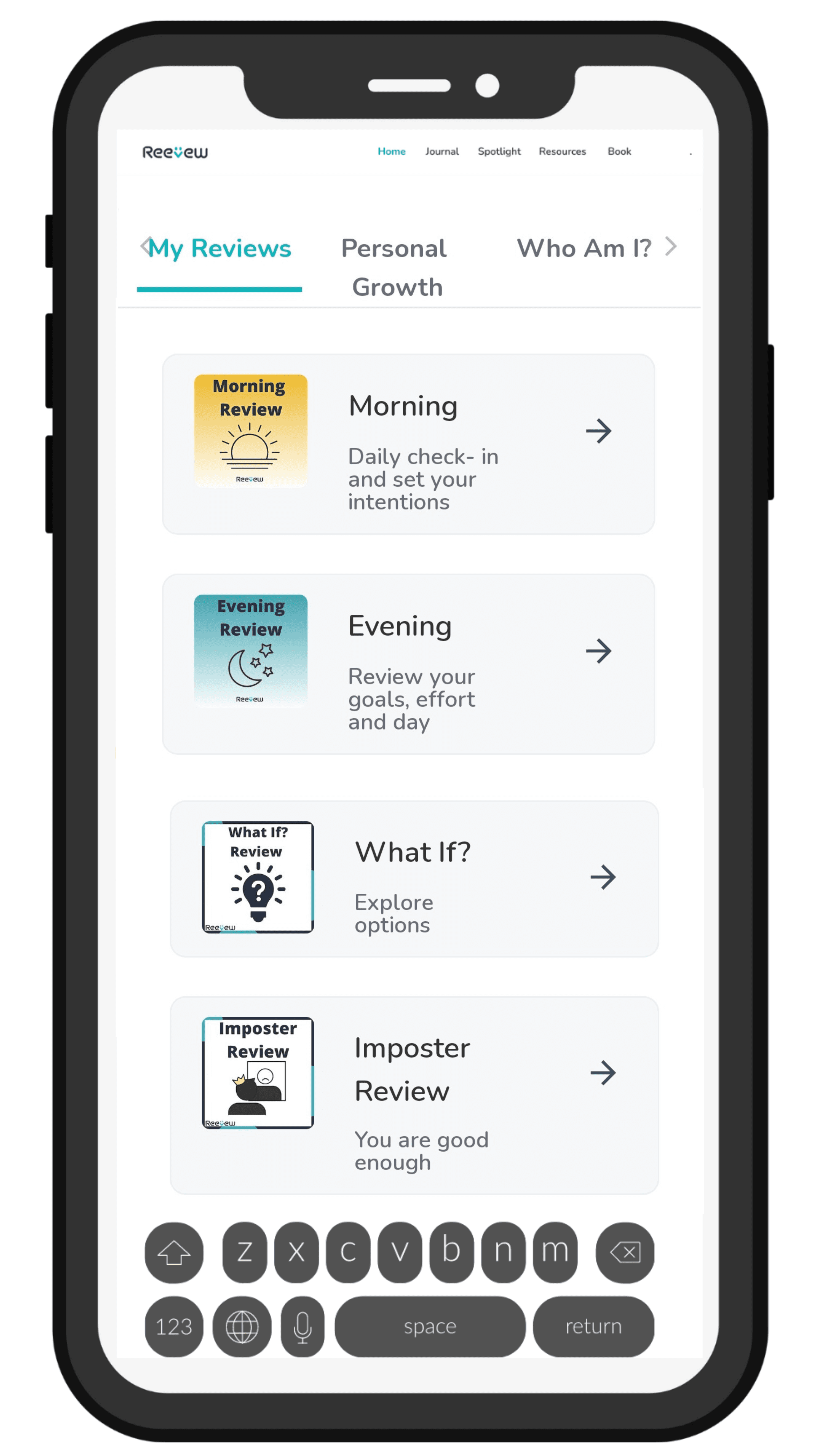 When you put those thoughts on the page, they slow down. You can see what matters and what does not. This is the heart of your Reevew journal: a simple way to get thoughts out, clear your mind and choose how you want to grow.